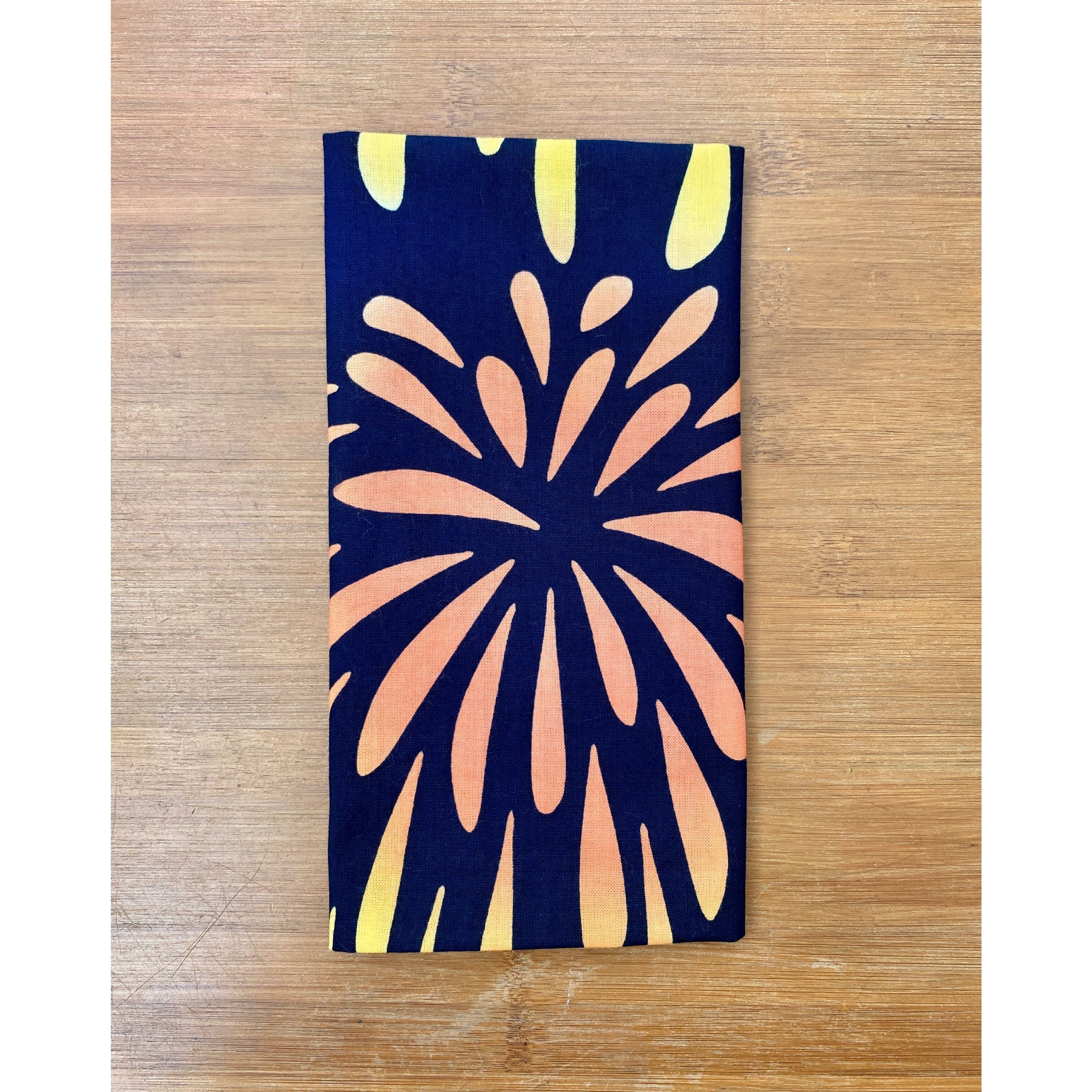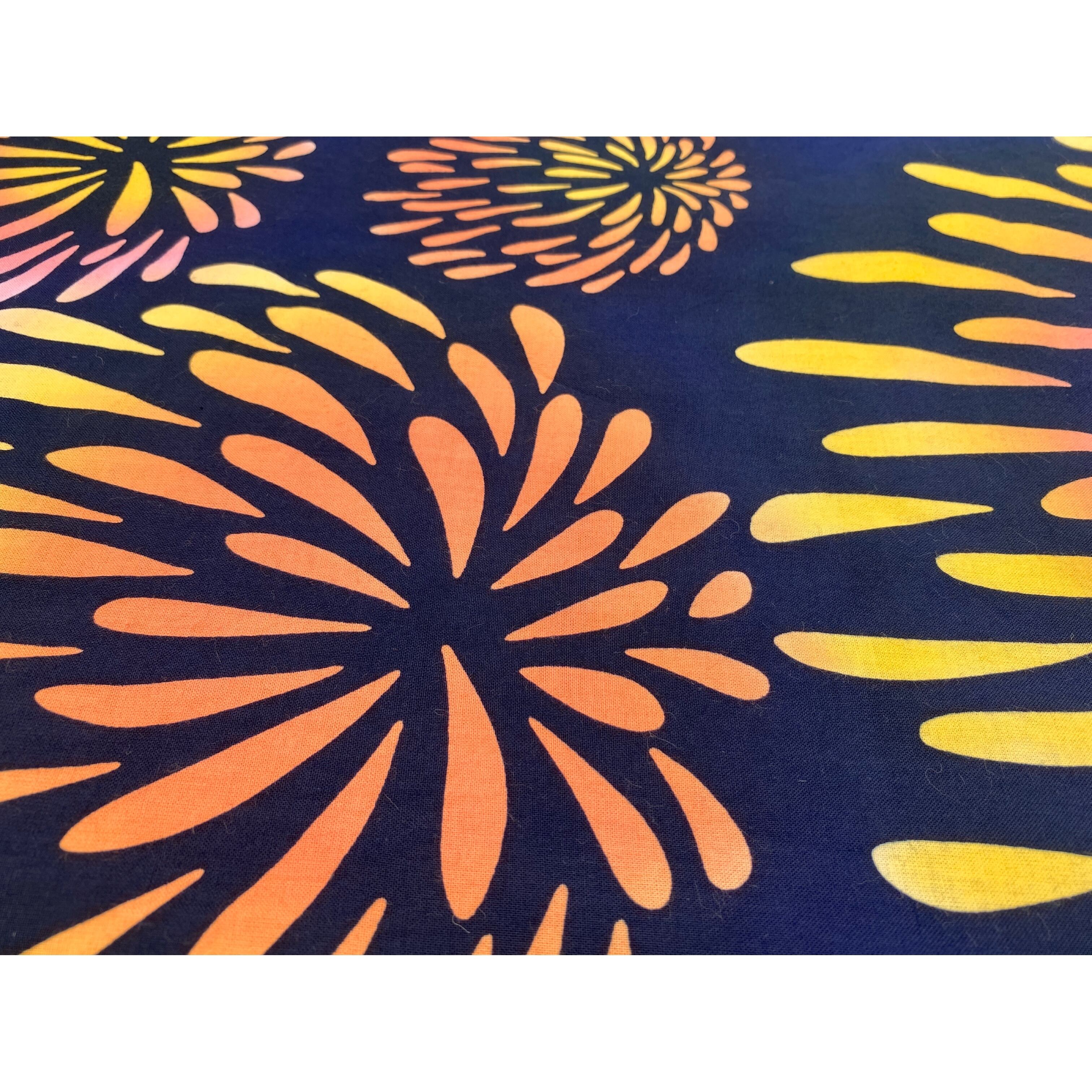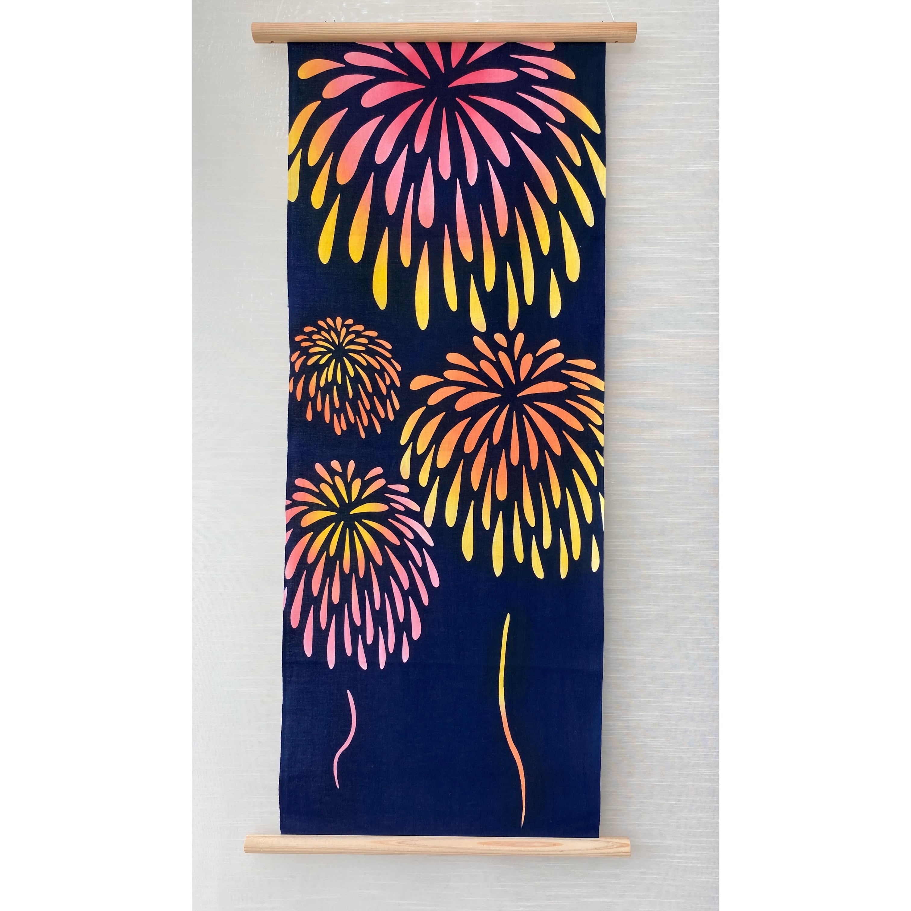 地色は濃紺に花火はオレンジや黄色、ピンクなど鮮やかな色で染めました。