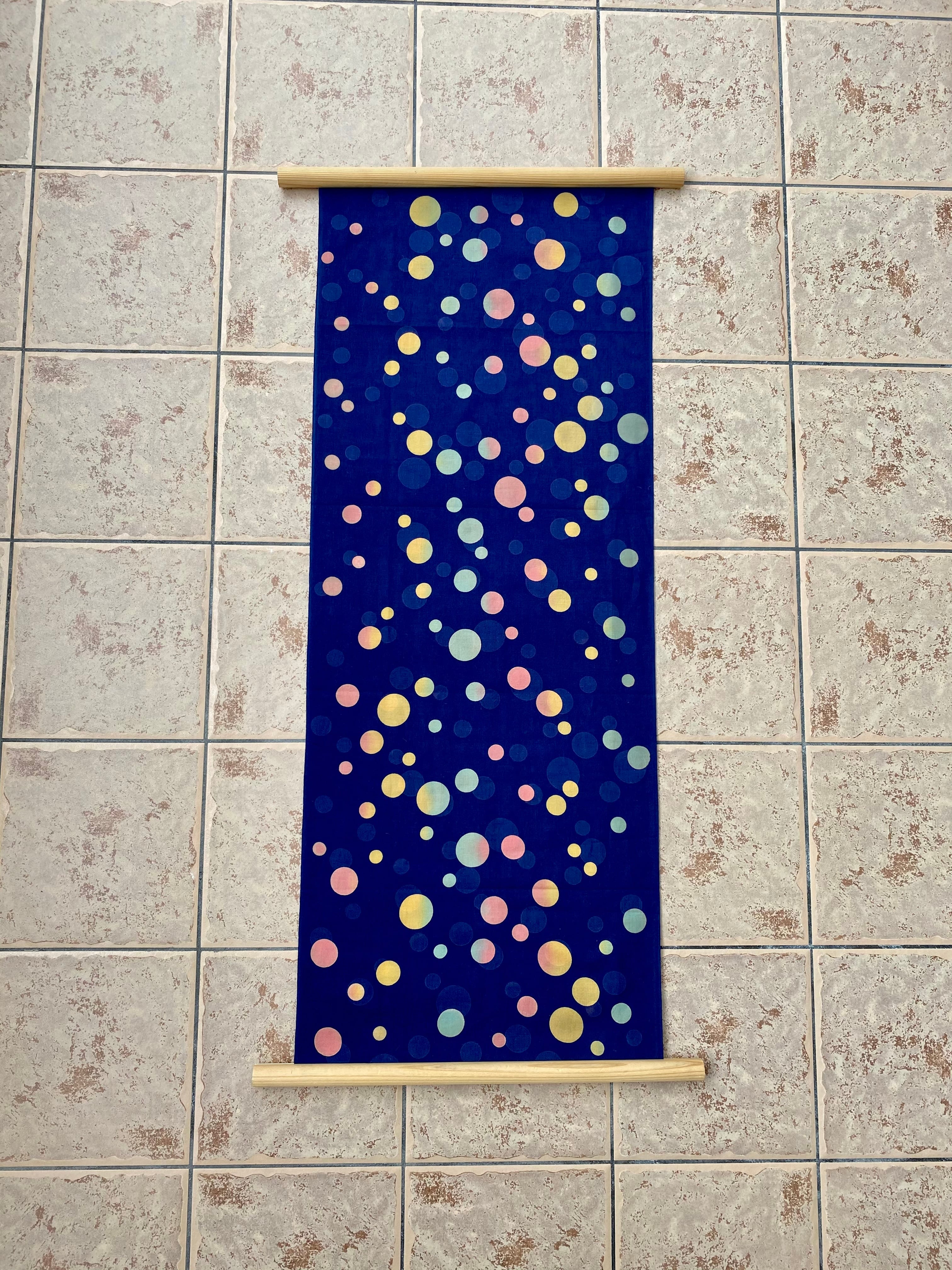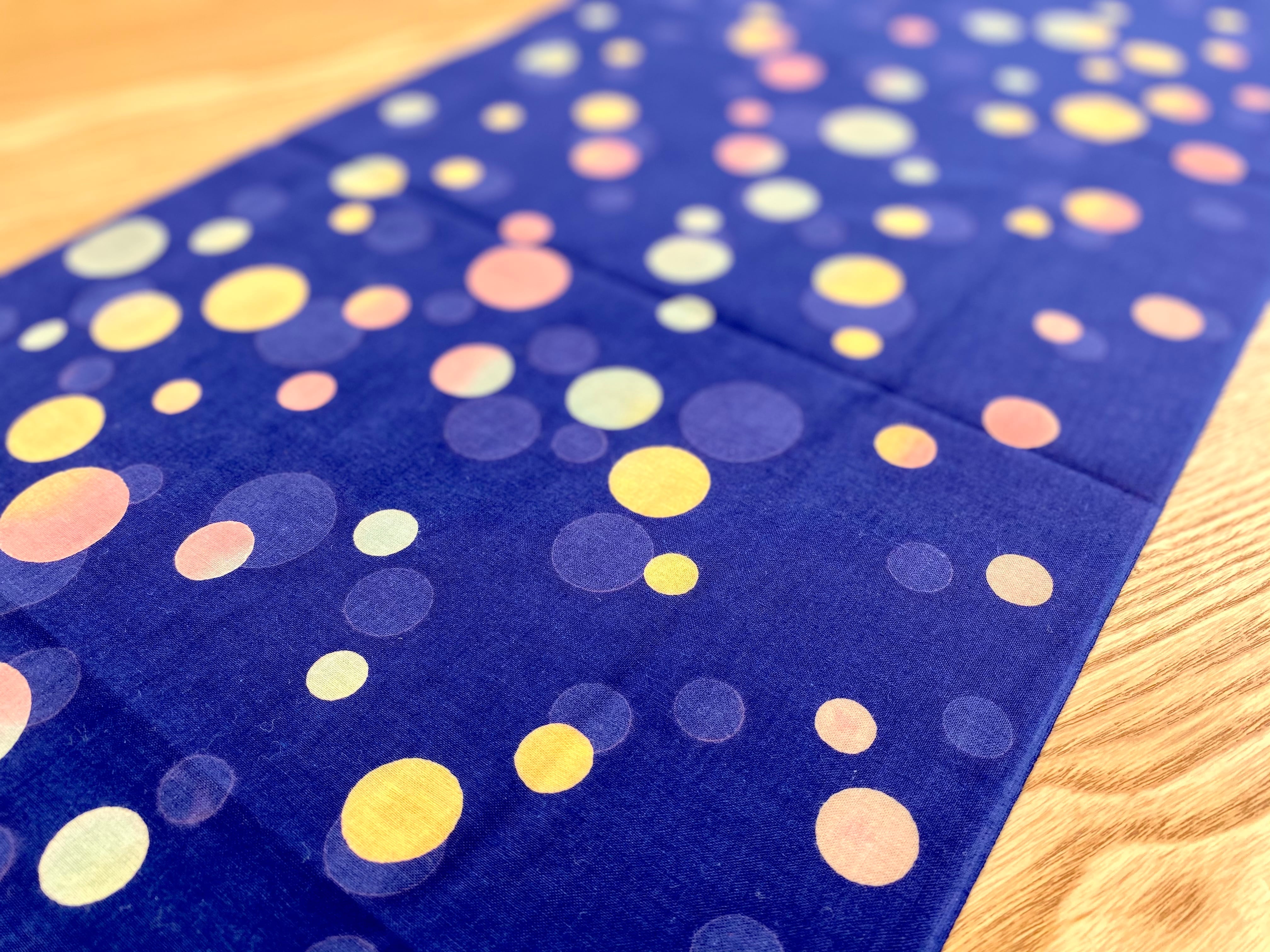紺色ベースの落ち着いた雰囲気の水玉模様の手ぬぐいに水玉がアクセントになっています。